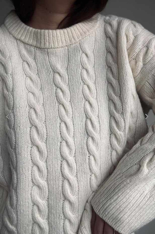 Джемпер с посадкой oversize вяжется полностью узором «косы» сверху вниз (конструкция японское плечо). Двойная горловина резинкой 1х1. Поворотное и круговое вязание. Рукава вяжутся от пройм джемпера. Для хорошей посадки свобода облегания примерно 25 см.